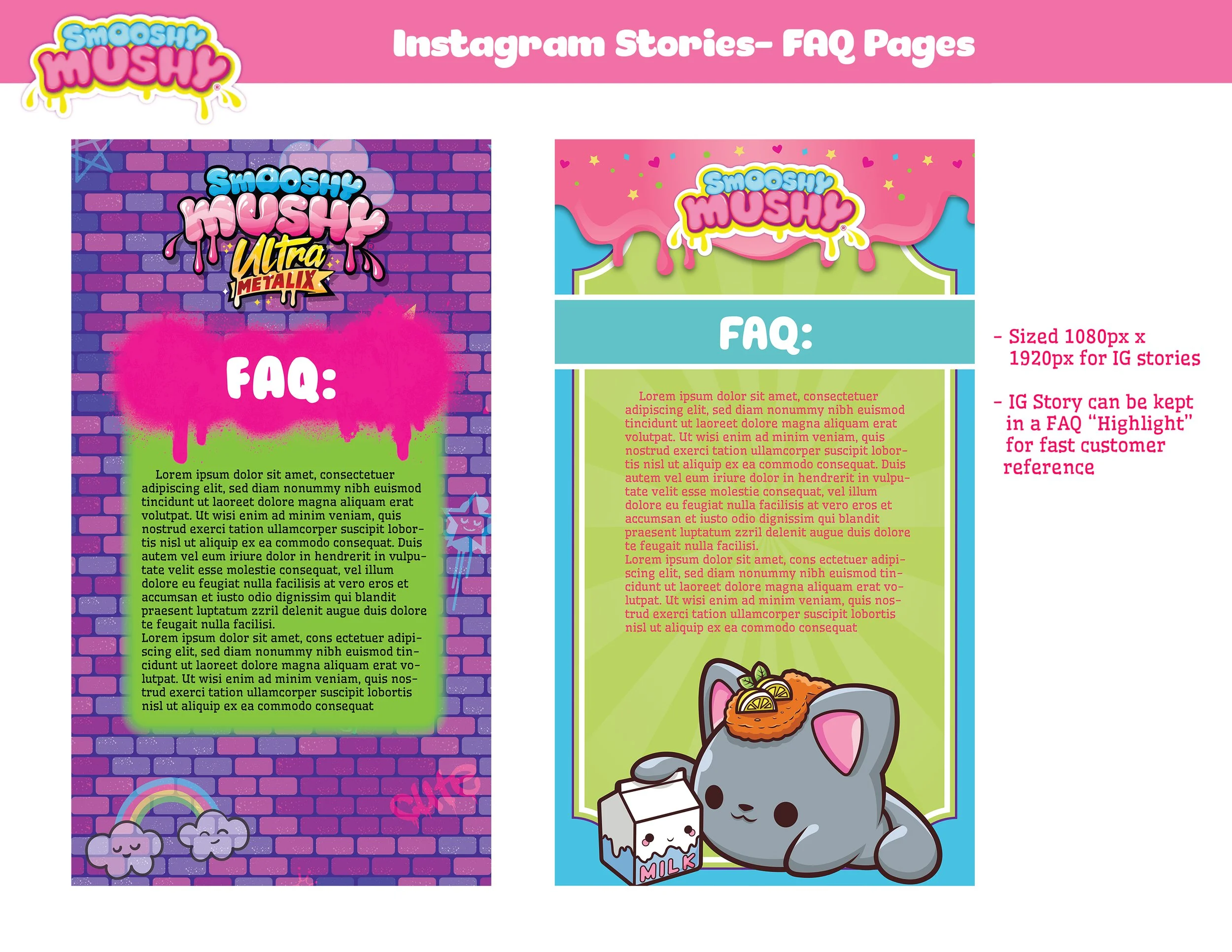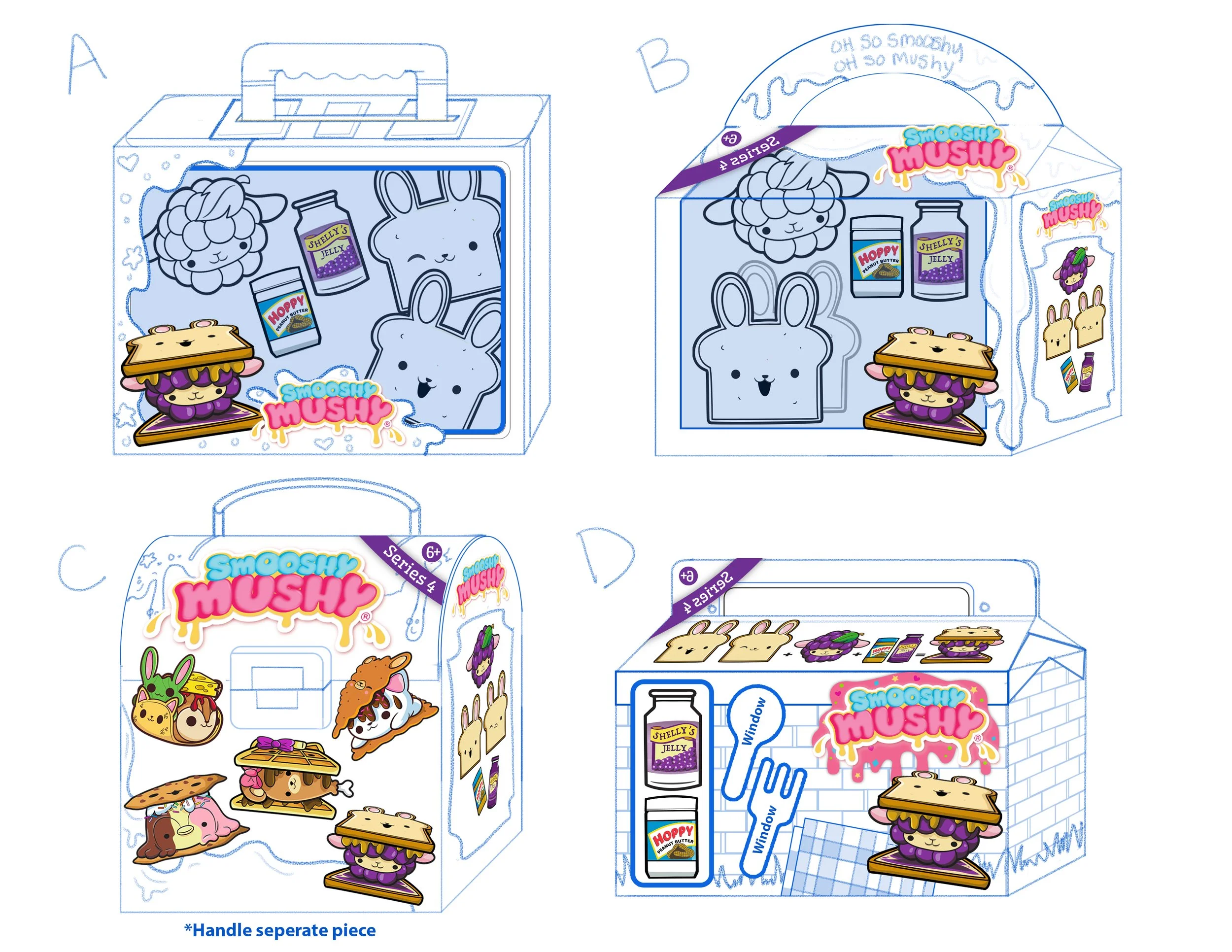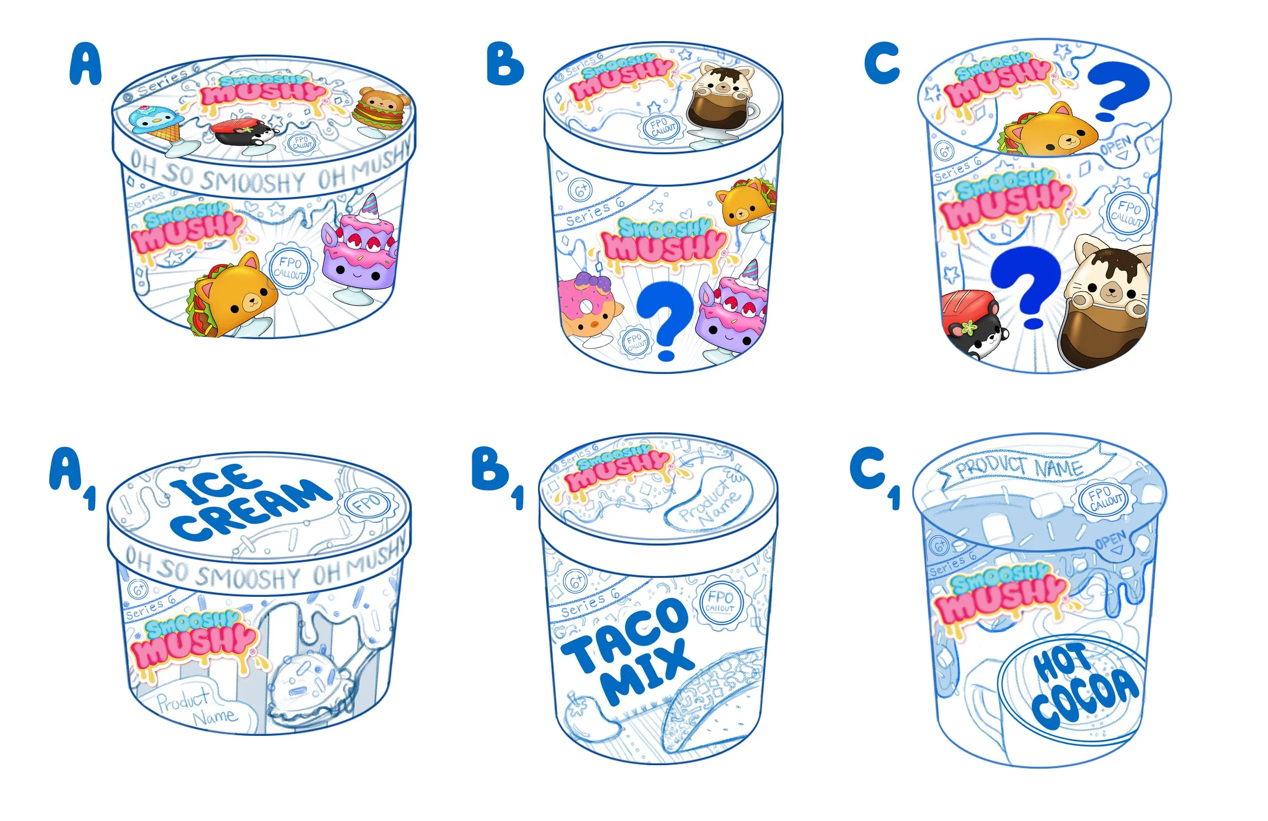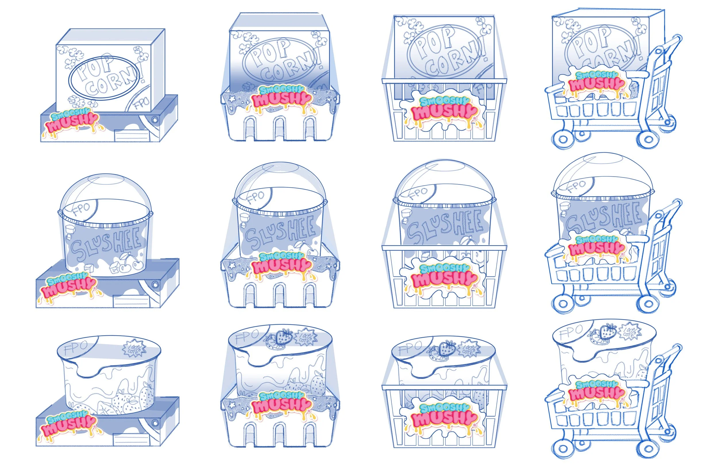 Squeezable squishy friends in perfectly paired Smooshy Mushy portions! Created for RedwoodVentures & OLO Industries. Within my team, I focused on Package Concepts, Packaging, and Character Art.